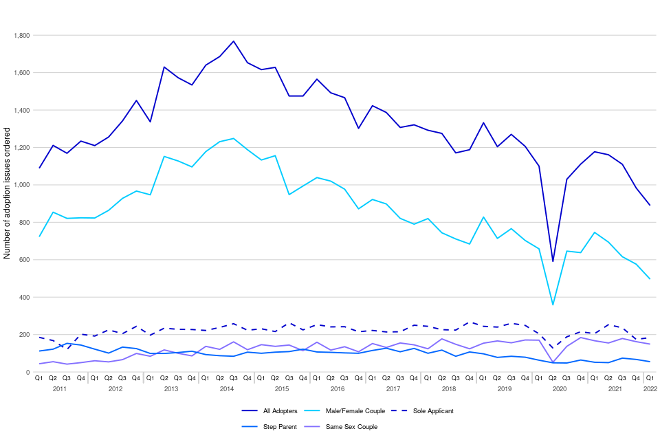 The chart below shows the trend of adoption orders by the type of adopter. This shows that during January to March 2022, 56% of all adoption orders were issued to mixed-sex couples, 21% to sole applicants, 17% to same-sex couples and 6% to step-parents.