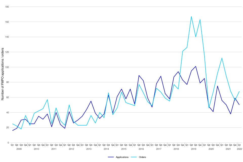 The number of applications and orders made for forced marriage protection orders (FMPOs) is very small. Consequently, numbers fluctuate each quarter but overall there was a long term upward trend from their introduction in November 2008 until the end of 2019.