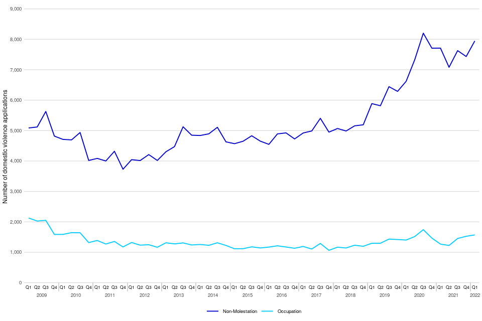 In January to March 2022, there were 8,238 domestic violence remedy applications, up by 3% on the same quarter in 2021 requesting a total of 9,517 orders (multiple orders can be applied for in a single application). Most of the orders applied for were non-molestation orders (83%) compared to occupation orders (17%); these proportions have remained relatively consistent in recent years. Applications for non-molestation and occupation orders in January to March 2022 were both up, by 3% and 24% respectively, compared to the same period in 2021.