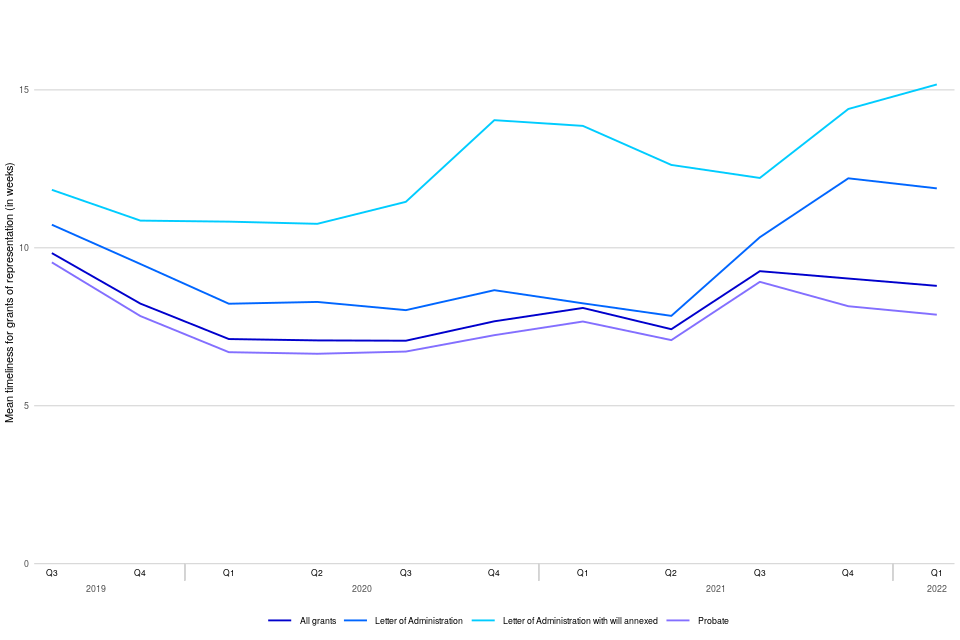Timeliness of grants issued can be affected if the case has been ‘stopped’ for any reason (which can occur when there’s a dispute about either who can apply for probate or issues with a will or proposed will, or if an error is identified and a request for further information made). Probate grants that were stopped during January to March 2022 took 15 weeks on average to be issued, compared to 5 weeks for those that were not stopped.