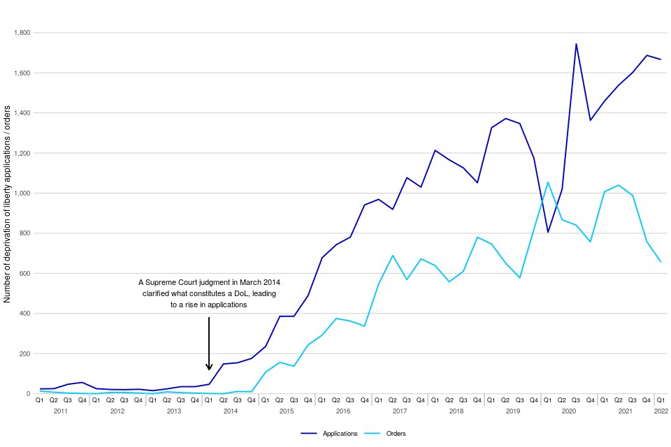 There were 1,666 applications relating to deprivation of liberty made in the most recent quarter, which is an increase of 14% on the number made in the same quarter in 2021. There was a decrease by 35% in the orders made for deprivation of liberty over the same period from 1,007 to 656.