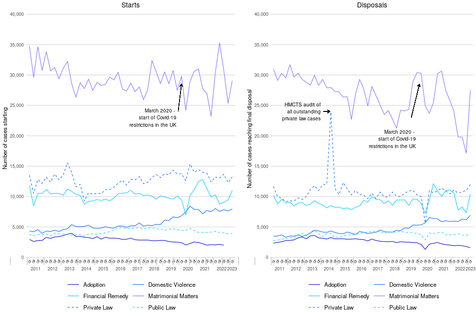 During January to March 2023, the number of financial remedy cases starting increased compared to the equivalent period last year and private law cases and domestic violence remedy cases starting remained broadly similar. Matrimonial matters and public law cases starting decreased (by 4% and 7% respectively) compared to the same period last year. Almost all closed cases have increased over the same period, with private law and domestic violence remedy cases reaching final disposal the highest in their series.