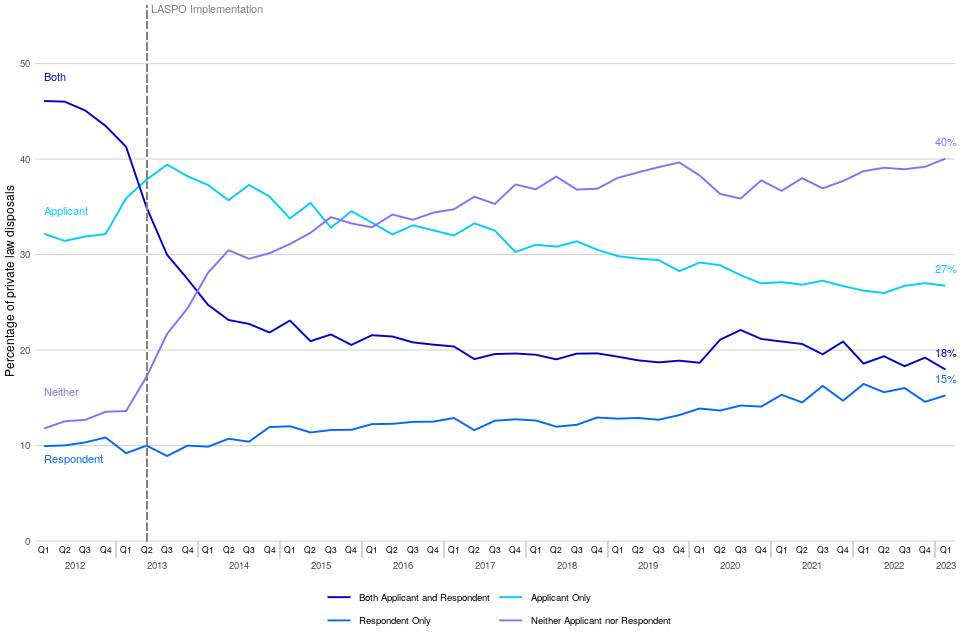 The removal of legal aid for many private law cases in April 2013 resulted in a change in the pattern of legal representation over time[footnote 2],[footnote 3]. In January to March 2023, the proportion of disposals where neither the applicant nor respondent had legal representation was 40%, increasing by 26 percentage points since January to March 2013, and up 1 percentage point from January to March 2022.