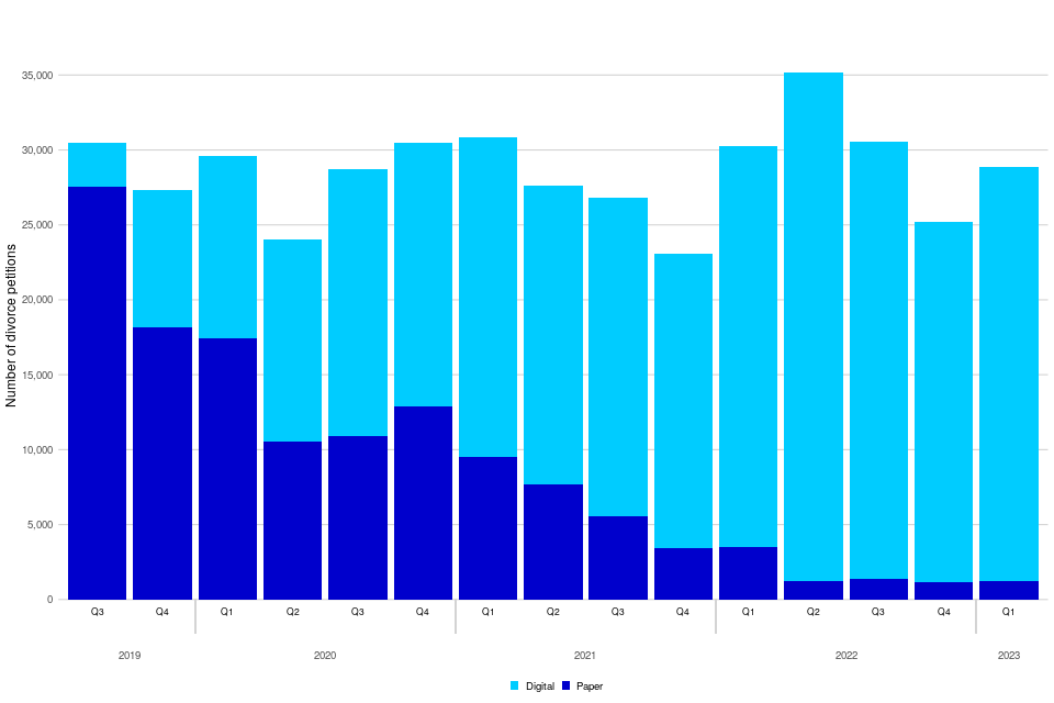 | There were 28,865 divorce applications under the new legislation this quarter | New divorce legislation came into effect from 6th April 2022. Between January to March 2023 there were 28,865 applications made (76% from sole applicants, 24% from joint applicants), including those for dissolution of civil partnerships. |