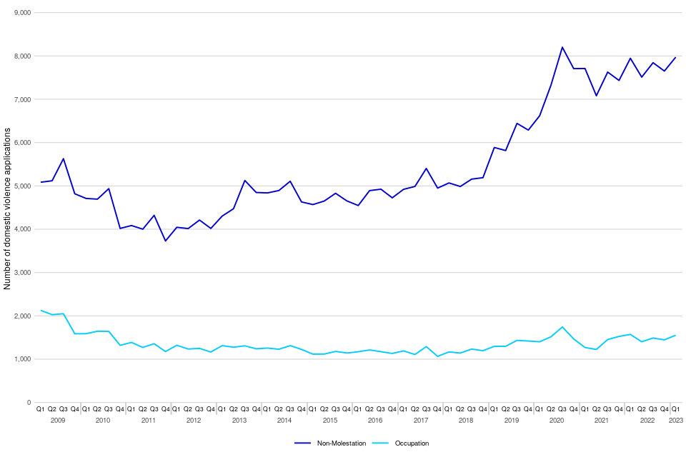 In January to March 2023, there were 8,275 domestic violence remedy applications, similar to the same quarter in 2022, requesting a total of 9,524 orders (multiple orders can be applied for in a single application). Most of the orders applied for were non-molestation orders (84%) compared to occupation orders (16%); these proportions have remained relatively consistent in recent years. Applications for non-molestation orders in January to March 2023 remained at a similar level compared to the same period in 2022, while occupation order applications decreased by 1%.