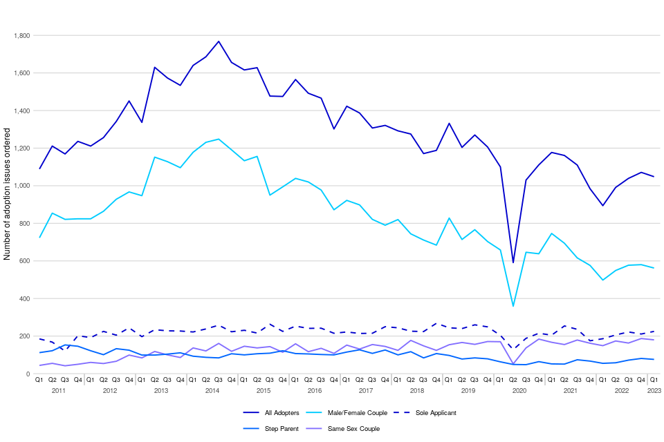 During January to March 2023, there were 1,085 adoption applications made, up 6% from the equivalent quarter in 2022. Over the same period, the number of adoption orders issued also increased by 17% to 1,048. The overall picture highlights a longer-term decrease in the number of applications and orders with the highest number of adoption applications and orders in 2014 Q1 (1,831) and 2014 Q3 (1,768) respectively (Tables 18 and 19).