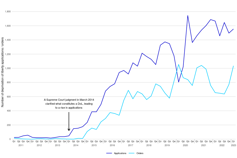 Since the Supreme Court clarified the definition of deprivation of liberty in 2014, there has been a significant increase in the number of applications. There were 15 applications in January to March 2013 which increased to a high of 1,744 in July to September 2020. There were 1,554 applications in January to March 2023. Whilst deprivation of liberty orders made saw an increase by 58% from 656 last year to 1,035 in the latest quarter, the number of orders made was similar to the equivalent quarters in both 2020 and 2021.
