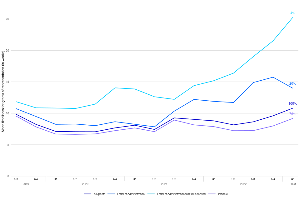 Timeliness of grants issued can be affected if the case has been ‘stopped’ for any reason (which can occur when there’s a dispute about either who can apply for probate or issues with a will or proposed will, or if an error is identified and a request for further information made). Probate grants that were stopped during January to March 2023 took 20 weeks on average to be issued, compared to 6 weeks for those that were not stopped.