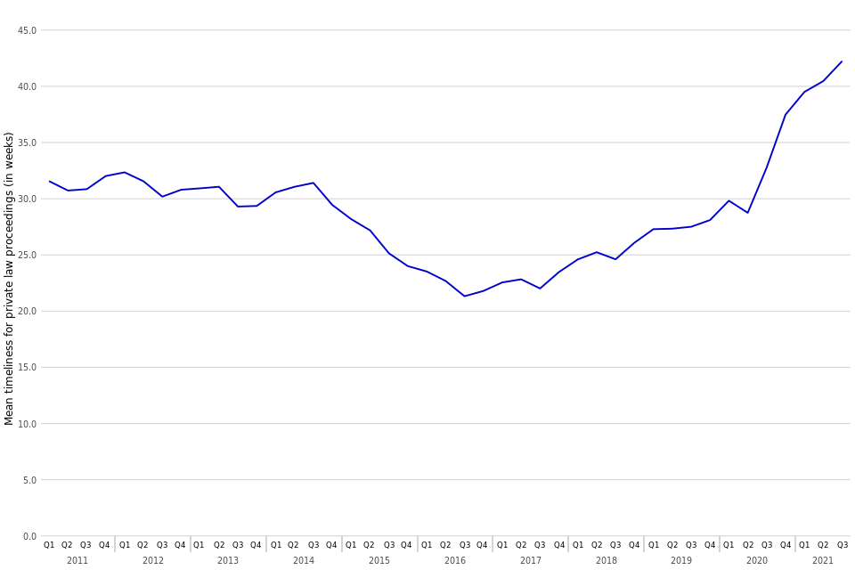 The average time for divorce and annulment cases to reach first disposal was down 3 weeks compared to the equivalent quarter in 2020. Private law cases took longer, with the average time to first disposal in July to September 2021 taking 26 weeks, up 7 weeks compared to the same period in 2020.