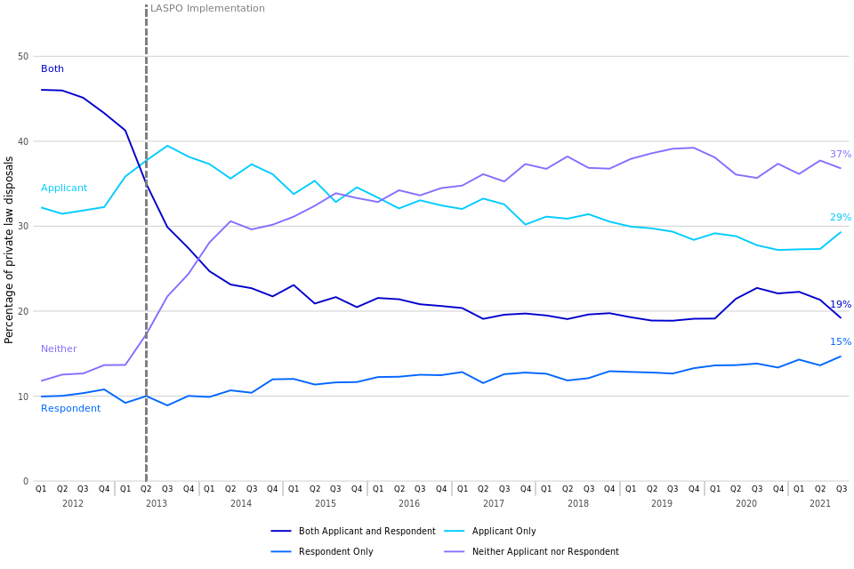 Correspondingly, the proportion of cases where both parties had legal representation went from 41% in January to March 2013 to 19% in July to September 2021, down 4 percentage points compared to the same period in 2020 (Figure 4).