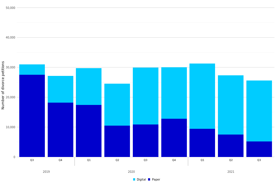 For digital divorce cases (i.e. those dealt with the Courts and Tribunals Service Centres that are digital at all stages), there were 20,397 petitions made during July to September 2021 (80% of the total, up from 64% in the same period of 2020). The average time to decree nisi for July to September 2021 was 14 weeks, and 24 weeks from petition to decree absolute.