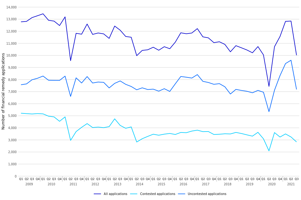 There were 10,015 financial remedy applications made in July to September 2021, down 7% from the same period in 2020, while there were 11,788 financial remedy disposals events, up 11%. During this period, 72% of applications were uncontested and 28% were contested.