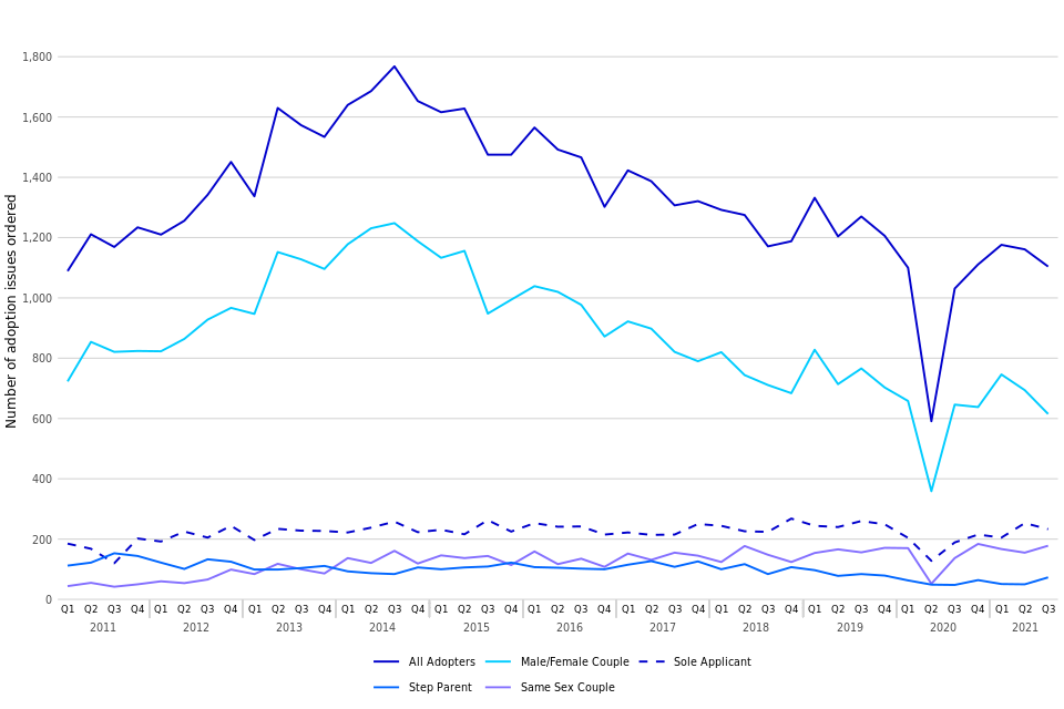 | Adoption applications decrease while the number of orders increase | In July to September 2021 there were 954 adoption applications, down 14% on the equivalent quarter in 2020. Whereas, the number of adoption orders issued increased by 7% to 1,104. |