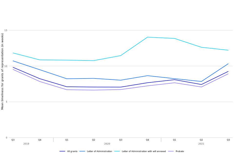 Timeliness of grants issued can be affected if the case has been ‘stopped’ for any reason (which can occur when there’s a dispute about either who can apply for probate or issues with a will or proposed will, or if an error is identified and a request for further information made). Probate grants that were stopped during July to September 2021 took 15 weeks on average to be issued, compared to 5 weeks for those that were not stopped.