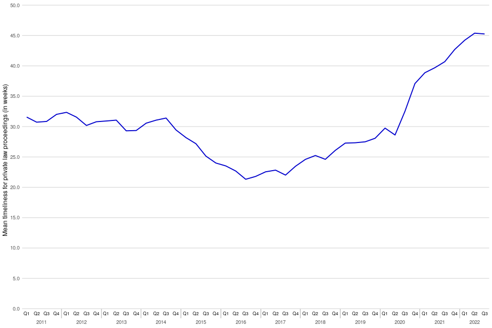 Figure 3: Private law timeliness from case start date to final order in the family court, January to March 2011 to July to September 2022 (Source: Table 9)