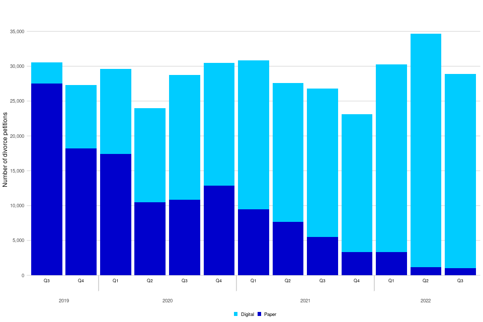 | There were 28,921 divorce applications under the new legislation | New divorce legislation came into effect from 6th April 2022. Between July to September 2022 there were 28,921 applications made (77% from sole applicants, 23% from joint applicants), including those for dissolution of civil partnerships |