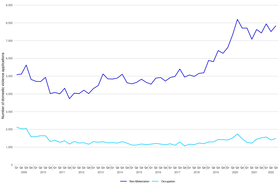 In July to September 2022, there were 8,104 domestic violence remedy applications, up by 2% on the same quarter in 2021 requesting a total of 9,328 orders (multiple orders can be applied for in a single application). Most of the orders applied for were non-molestation orders (84%) compared to occupation orders (16%); these proportions have remained relatively consistent in recent years. Applications for non-molestation and occupation orders in July to September 2022 were both up, by 3% and 2% respectively, compared to the same period in 2021.