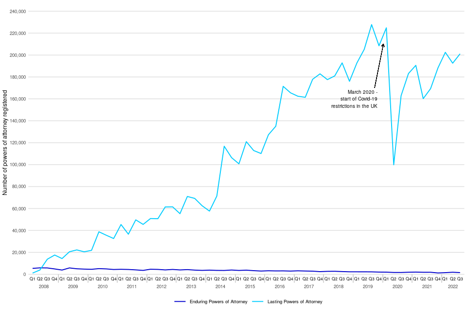 Figure 11: Powers of Attorney registered, January to March 2008 to July to September 2022 (Source: Table 22)