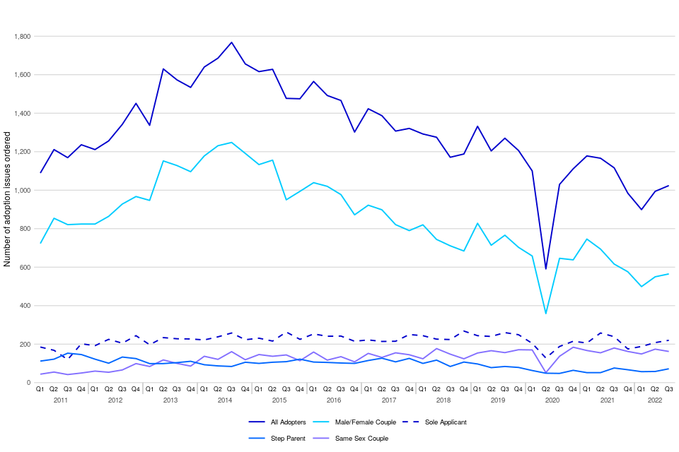 The chart below shows the trend of adoption orders by the type of adopter. This shows that during July to September 2022, 55% of all adoption orders were issued to mixed-sex couples, 21% to sole applicants, 16% to same-sex couples and 7% to step-parents.