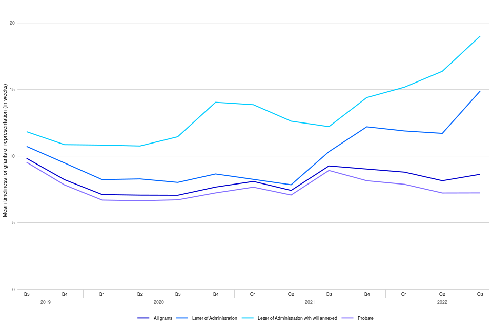 Timeliness of grants issued can be affected if the case has been ‘stopped’ for any reason (which can occur when there’s a dispute about either who can apply for probate or issues with a will or proposed will, or if an error is identified and a request for further information made). Probate grants that were stopped during July to September 2022 took 15 weeks on average to be issued, compared to 4 weeks for those that were not stopped.