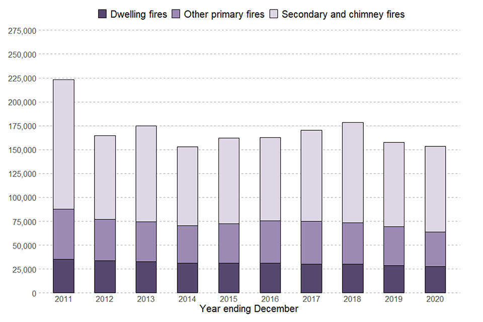 In the year ending December 2020 there were 64,066 primary fires (42% of the 153,278 fires attended). This was a seven per cent decrease compared with the previous year (69,184), a ten per cent decrease compared with five years ago (71,126) and a 37 per cent decrease compared with ten years ago (101,159). Compared with last year, there were decreases of four per cent in dwelling fires, 11 per cent in other buildings fires and 12 per cent in road vehicles fires, and an increase of three per cent in other outdoor fires.