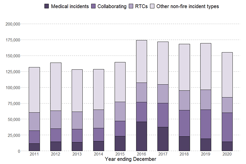 FRSs attend many types of incident that are not fires or fire false alarms. These are known as non-fire incidents or special service incidents. Examples include flooding incidents, responding to road traffic collisions, animal assistance and collaboration incidents such as effecting entry and or exit and assisting other agencies (a complete list can be found in fire data table FIRE0902).