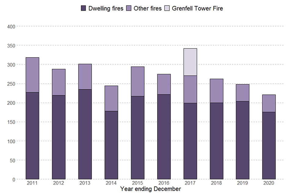 There were 221 fire-related fatalities in the year ending December 2020 compared with 248 in the previous year.
