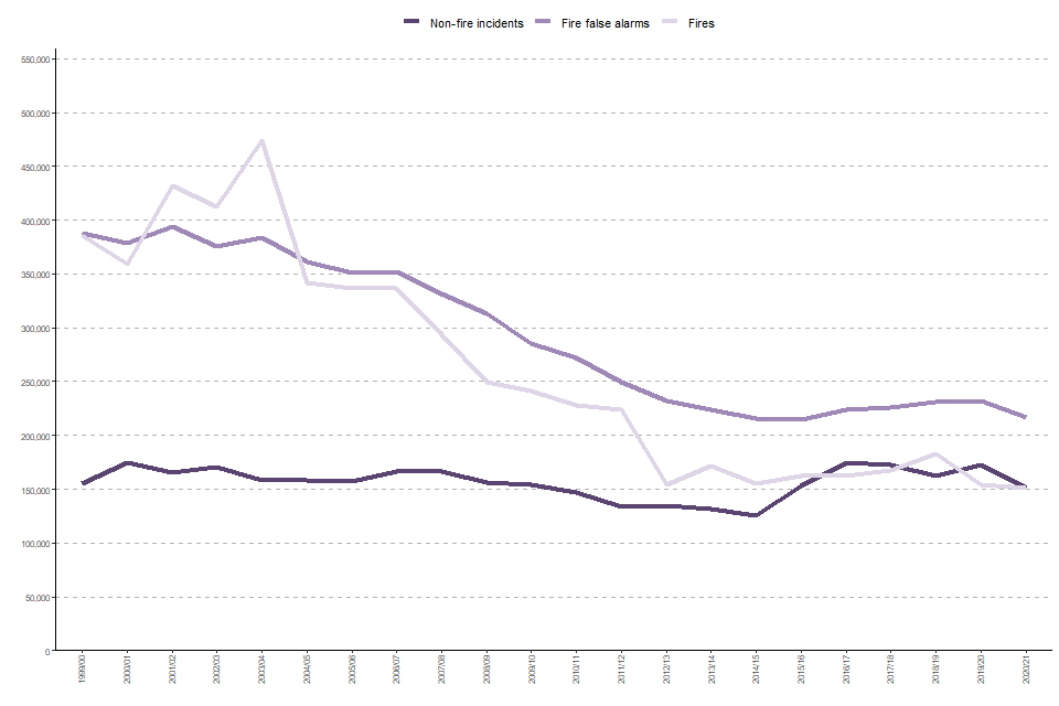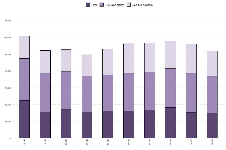 FRSs attended 518,263 incidents in year ending March 2021. This was a seven per cent decrease compared with the previous year (558,013). Of these incidents, there were 151,086 fires. This was a two per cent decrease compared with the previous year (154,180).