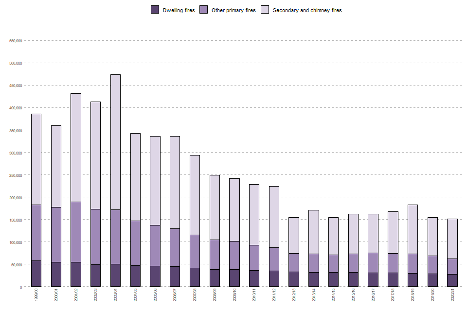The long-term picture shows that the total number of fires attended by FRSs decreased for around a decade - falling by around two thirds from a peak of around 474,000 in year ending March 2004 to around 154,000 in year ending March 2013. The total number of fires has fluctuated since year ending March 2013 and although year ending March 2021 was the lowest figure recorded since comparable statistics became available in year ending March 1996, restrictions on life throughout year ending March 2021 in response to the COVID-19 pandemic was an element in this relatively low figure.