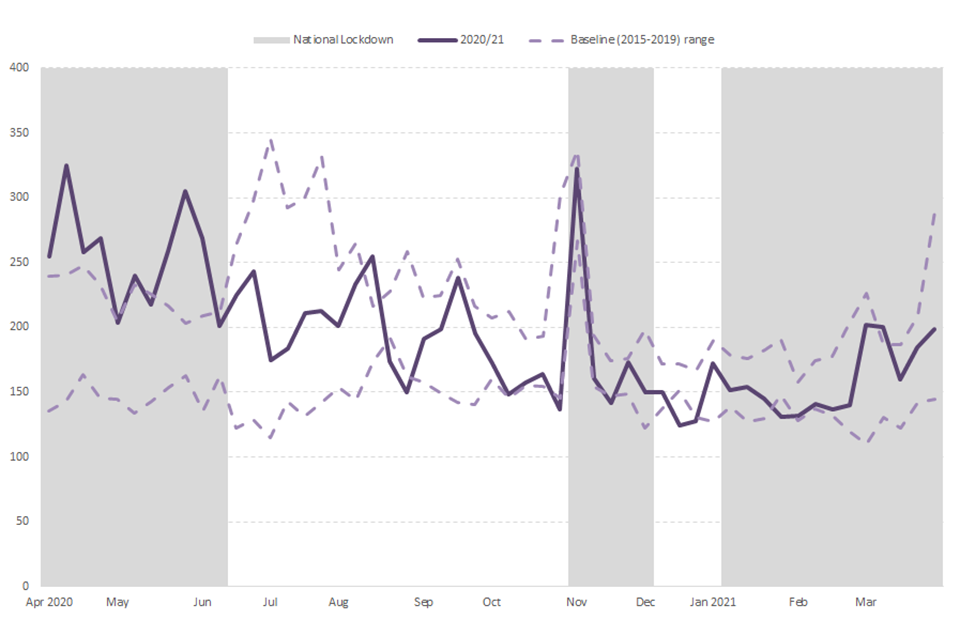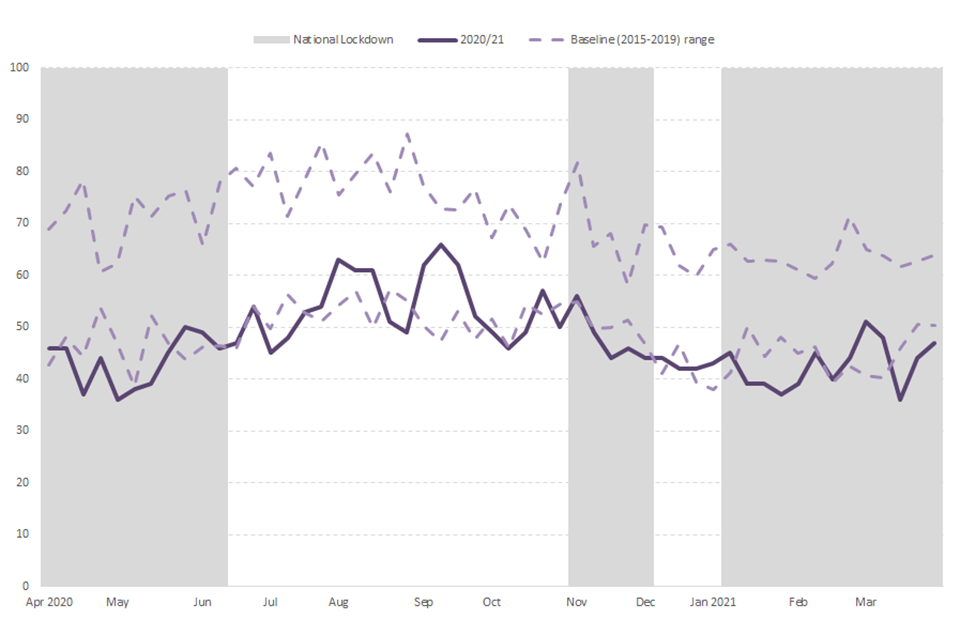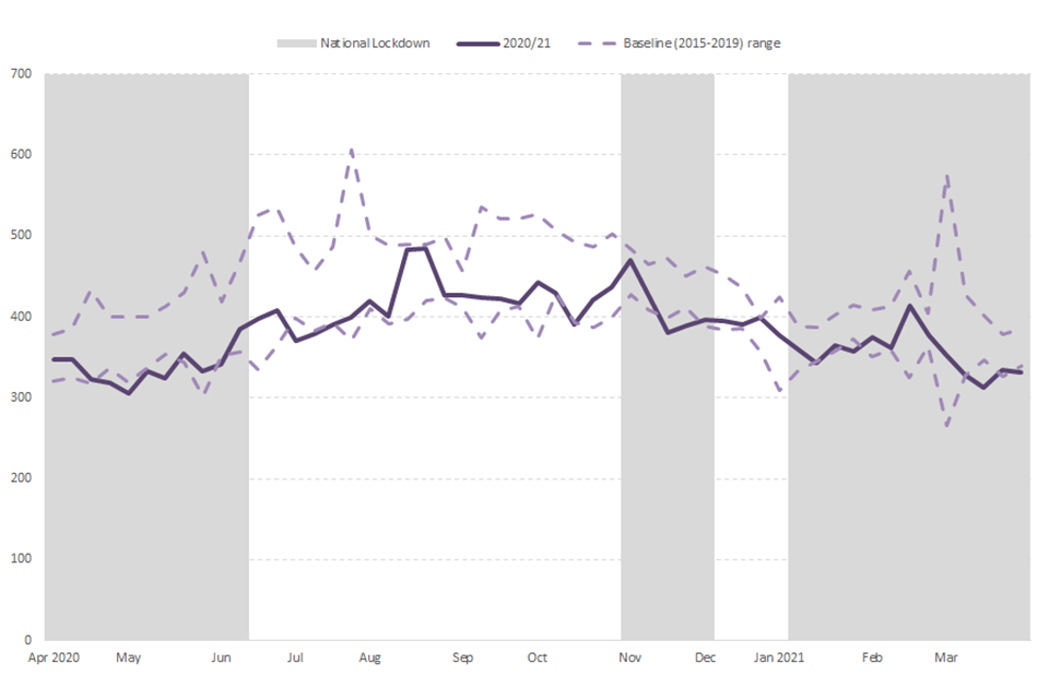 This section shows the average incident numbers per day of non-fire incidents by week in year ending March 2021 attended by FRSs compared against a baseline of the previous five years (year ending March 2016 to year ending March 2020). This analysis attempts to show if the three national lockdowns, various local lockdowns and restrictions on life throughout year ending March 2021 in response to the COVID-19 pandemic affected the number of these incidents attended by FRSs. The analysis used the same method as in the fire section.