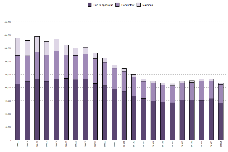 Fire false alarms are broadly categorised by motive into ‘due to apparatus’, ‘good intent’ and ‘malicious’. In year ending March 2021 there were: