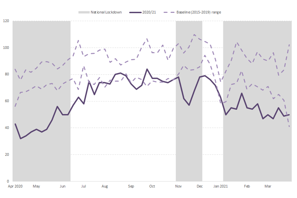 Weekly figures are highly susceptible to fluctuation and so an upper and lower range, using the mean and standard deviation of the year ending March 2016 to year ending March 2020 baseline figures, was calculated. Any figures beyond this range would fall outside of what would be expected, although these results could be explained by various factors such as the weather, school or bank holiday dates and not simply the restrictions on life throughout year ending March 2021. Whilst it is difficult to define exactly what constituted a “national lockdown” and when they started and finished, in this analysis we have used the dates when the majority of “non-essential retail” was closed.