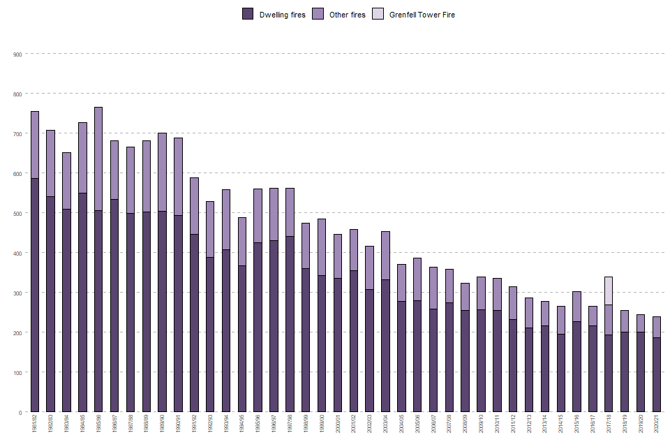 There were 240 fire-related fatalities in year ending March 2021 compared with 245 in the previous year. 240 is the lowest financial year figure since comparable data became available in year ending March 1982 and the number of fatalities has been at historically low levels in recent years.