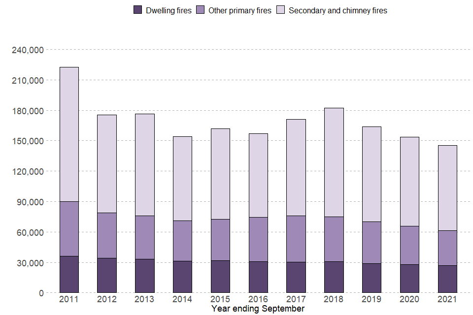The total number of fires decreased by five per cent from 153,438 in the year ending September 2020 to 145,208 in the year ending September 2021 (Figure 2.1). Primary fires fell by six per cent (from 65,549 to 61,570), with decreases in all types of primary fire (dwelling, other building, road vehicle and other outdoors). Secondary fires also decreased, by five per cent (from 84,764 to 80,436). The only fire type to show an increase was chimney fires (the least common fire type), from 3,125 to 3,202.