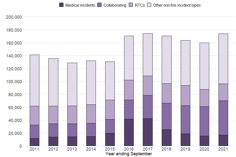 In the year ending September 2021 FRSs attended 174,036 non-fire incidents. This was a nine per cent increase compared with the previous year (159,940), a two per cent increase compared with five years ago (170,551) and a 23 per cent increase compared with ten years ago (141,602).