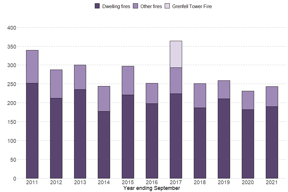 There were 243 fire-related fatalities in the year ending September 2021 compared with 231 in the previous year.