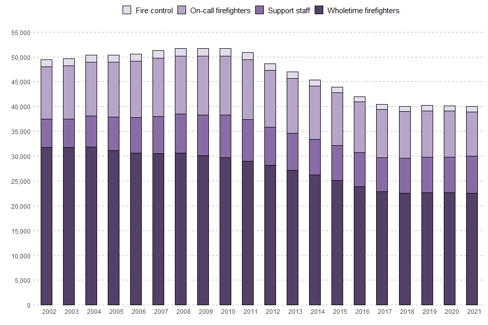 31,547 staff (FTE) were employed as firefighters on 31 March 2021. This is a one per cent decrease compared with the previous year (31,912 in 2020). Since 2011 the number of firefighters has decreased by 23 per cent whilst the total number of incidents and fires attended has decreased by 20 per cent and 34 per cent respectively.