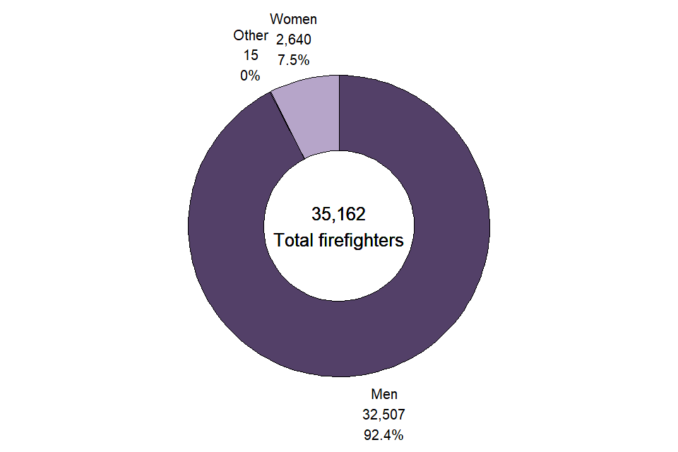 The number and proportion of women firefighters has slowly increased from 2002 (the first year for which comparable data are available) from 1.7 per cent (753) of all firefighters to 7.5 per cent (2,640) in 2021. For comparison, the percentage of police officers in England and Wales as at 31 March 2021 that were women was 32.4 per cent[footnote 2].