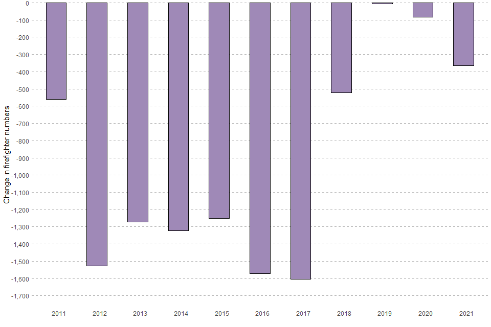 Overall, there were 365 fewer firefighters (FTE) in 2021 compared with the previous year (see Figure 1.2). This follows two years of comparatively small decreases. There was a decrease of around 500 in 2018 compared with 2017 and prior to this there was a period of sustained decrease in firefighters of between around 1,200 and 1,600 per year from 2012 to 2017.