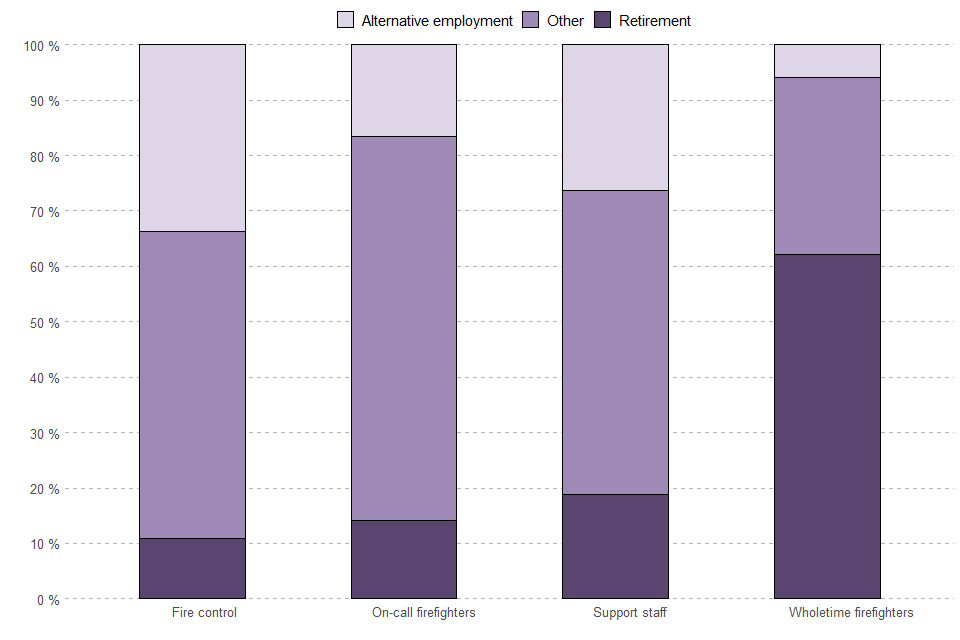 See Figure 1.3 for further detail. The ‘Other’ category includes the following reasons for leaving: ‘Moving to another FRS’, ‘Moving within FRS from operational (firefighter or control) to support staff’, ‘Resignation due to ill health’, ‘Resignation for any other reason’, ‘Resignation due to issues with primary employment/other work commitments’, ‘Resignation for personal reasons (including work / life balance & caring responsibilities)’, ‘Resignation due to relocation/leaving the area (including going travelling, moving country)’, ‘Compulsory redundancy’, ‘Voluntary redundancy’, ‘Dismissal for poor performance (including failure to maintain fitness)’, ‘Dismissal on disciplinary grounds’, ‘Deceased’ and ‘Unknown / Reason for leaving not recorded’.