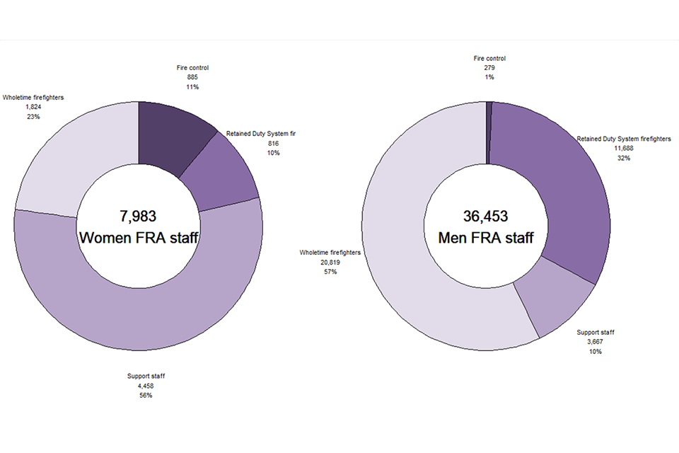18.0 per cent of all staff employed by FRAs were women as at 31 March 2021. This is slightly higher than in previous years (17.3% in 2020, 14.5% five years ago and 15.0% ten years ago).