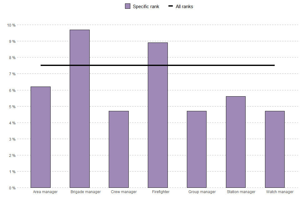 The rank of women firefighters shows a mixed story, with the top and lowest ranks (brigade managers and firefighters) showing above average proportions of women (9.7% and 8.9% respectively, compared with 7.5% for all ranks). The middle ranks (area manager, group manager, station manager, watch manager and crew manager) all showed proportions of women lower than the average for all ranks (ranging from 4.7% to 6.3%).