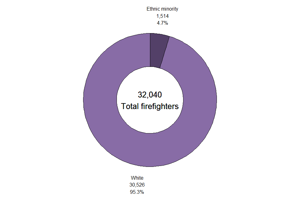 4.7 per cent (1,514) of firefighters employed by FRAs who stated their ethnicity were from an ethnic minority, compared with 4.4 per cent (1,410) in the previous year and 3.8 per cent (1,269) five years ago