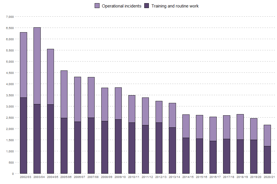 Between financial year 2003 to 2004 and financial year 2014 to 2015 the number of firefighters injured was on a downward trend, partly reflecting the reduced number of incidents attended as well as other factors. Injuries decreased in both operational incidents (by more than two-thirds) and training and routine activities (by around a half). Since financial year 2014 to 2015 the number of injuries plateaued at around 2,600 injuries per year before decreasing slightly to 2,466 injuries in financial year 2019 to 2020 and again to 2,166 in financial year 2020 to 2021.