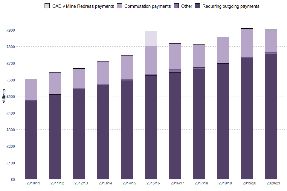 the Firefighters’ Pension Scheme total expenditure was around £902 million, a less than one per cent decrease compared with the previous year (£909 million in financial year 2019 to 2020) and one per cent higher than five years previously (£892 million in financial year 2015 to 2016)