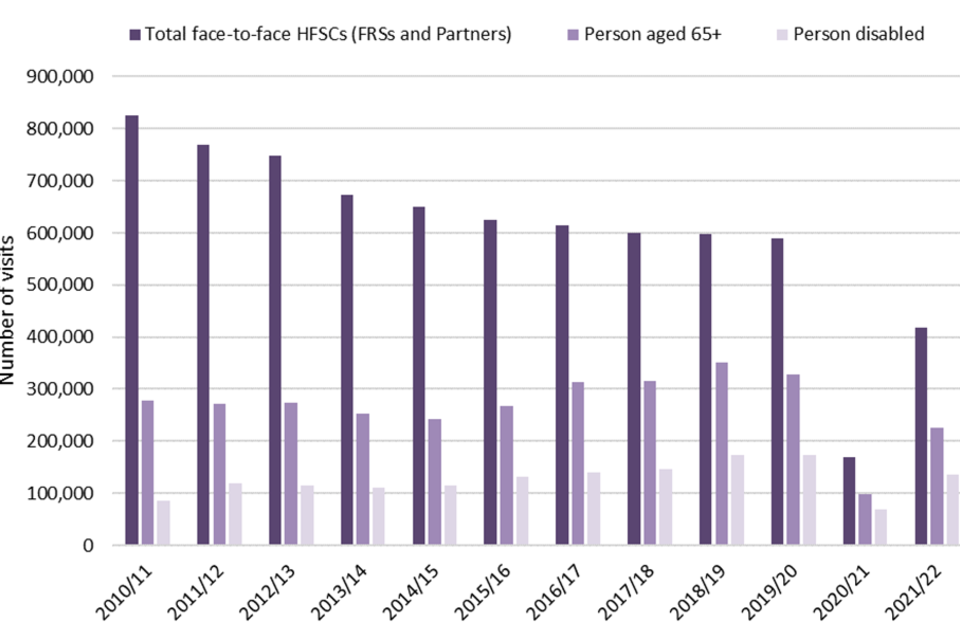 - FRSs and their partners completed 141,131 HFSCs targeted at disabled people (96% face to face), accounting for 32% of HFSCs. In comparison, in financial year 2020 to 2021, 92,125 HFSCs were targeted at disabled people (75% face to face), accounting for 35% of HFSCs, while in the financial year 2019 to 2020 173,413 HFSCs were targeted at disabled people, equivalent to 29% of HFSCs (Source: FIRE1201)
