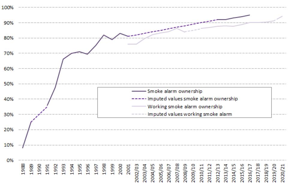 - As of most recent data in financial year 2020 to 2021, 94 per cent of households owned a working smoke alarm, an increase of three percentage points since financial year 2019 to 2020, a five percentage point increase since financial year 2015 to 2016 (89%) and an increase of 18 percentage points since 2001 (76%, the earliest date for which these data are available) (Source: FIRE0701)
