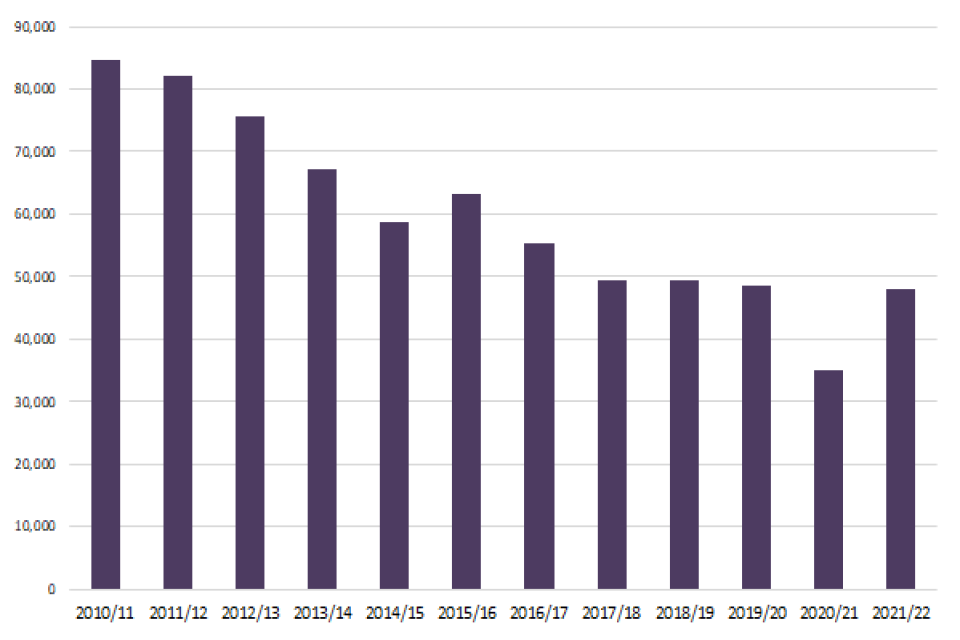 The number of home fire safety checks (HFSCs) has been in decline over the last decade. In the financial year 2021 to 2022, data shows a continuation of this general trend (albeit, with a year-on-year increase when compared to the covid-impacted data from the financial year 2020 to 2021). FRSs and their partners completed 443,153 HFSCs, up from 260,998 in the financial year 2020 to 2021, but down from the 588,666 HFSCs in the financial year 2019 to 2020. The number of HFSCs undertaken in financial year 2020 to 2021 was heavily affected by the COVID-19 pandemic and associated restrictions. At times during the financial year 2021 to 2022 some restrictions remained in place, but they were generally less severe than in the previous financial year. This likely contributed to the increases in prevention and protection activity seen this financial year. Levels of activity have however remained below pre-pandemic levels, likely as a result of some COVID-19 restrictions remaining in place until July 2021 and ongoing guidance around social contact [footnote 1].