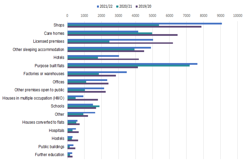 There were 6,449 audits of purpose-built blocks of flats of four storeys or more (13% of total audits) in financial year 2021 to 2022, down from the 7,183 (21%) in financial year 2020 to 2021 and 3,493 (7%) in the financial year 2019 to 2020. The number of Fire Safety Audits of other premises increased compared with the previous year.