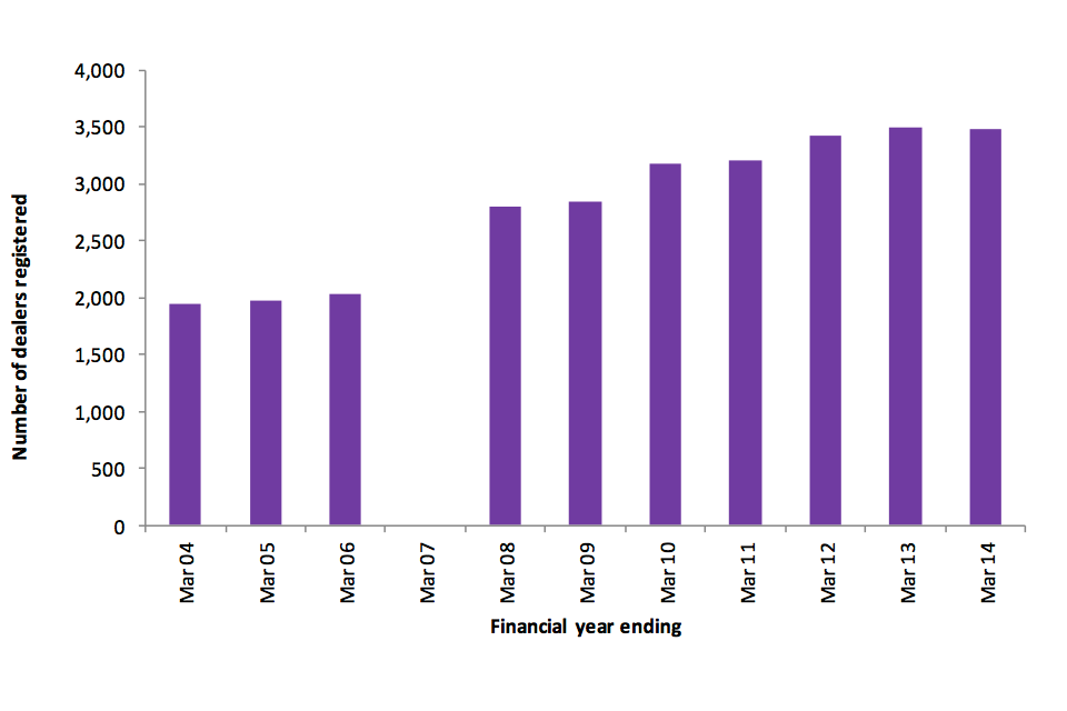Number of dealers registered; March 2004 1,950; March 2005 1,970; March 2006 2,030; March 2007 no figures available; March 2008 2,792; March 2009 2,840; March 2010 3,182; March 2011 3,205; March 2012 3,417; March 2013 3,496; March 2014 3,486